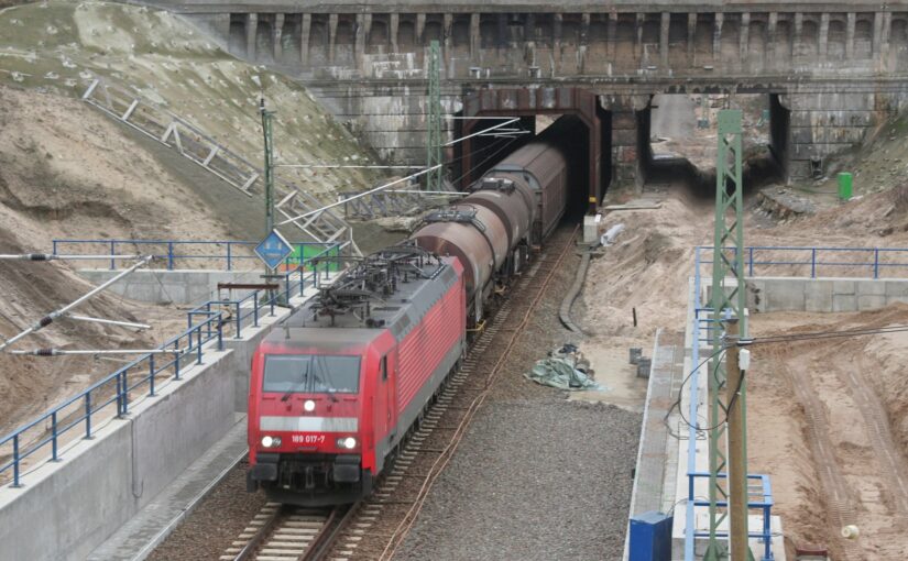 189 017-7 zieht einen gemischten Güterzug mit Knickkesselwagen, Schiebewandwagen und Kesselwagen durch das alte Kreuzungsbauwerk mit dem Oder-Havel-Kanal. Am Ende wird 298 326-6 noch mitgeschleppt.