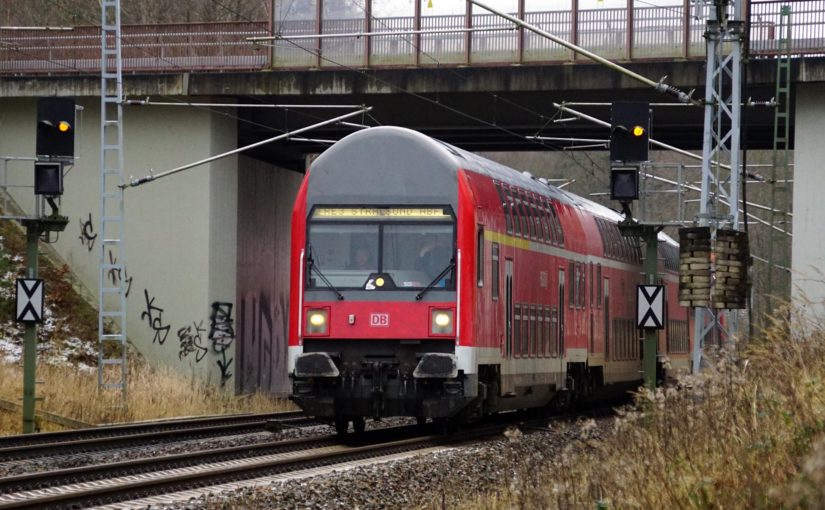 Beim RE3 nach Stralsund fährt der Steuerwagen DABgbuzf 760 nach Norden, die Lok 112 107 schiebt. Gesehen unter der Brücke der L24 nördlich von Wilmersdorf. Auf dem 2. Bild ist im Hintergrund die Brücke der A11 zu erkennen. Der Tag ist trüb, ISO2000 war notwendig, um das Bild halbwegs scharf zu bekommen.