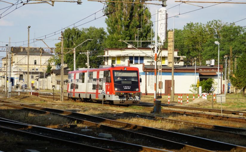 Unter der Brücke am westlichen Bahnhofsausgang hindurch fotografiere ich SA108-004 beim Verlassen des Bahnhofs Krzyż Wielkopolski.