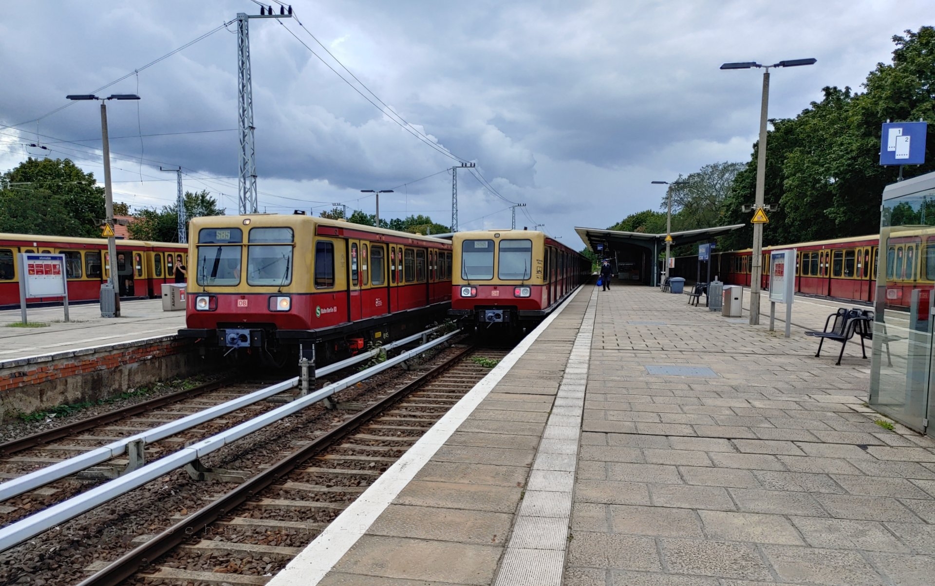 Berlin-Grünau ist Anfangs- und Endpunkt der S-Bahnlinie S85 (Grünau-Pankow). In Bildmitte stehen zwei Triebwagen der Baureihe 485, die als S85 unterwegs sind. Auf den Außenbahnsteigen angeschnitten stehen weitere 485er die als S-Bahn S46 (Birkenwerder-Zeuten) unterwegs sind.