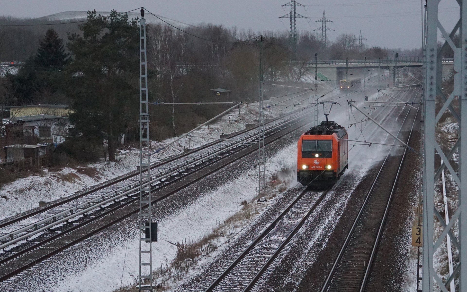 Am späten Nachmittag treffe ich auf dem Berliner Außenring auf die Lok 482 049-4, die mit dem Slogan Wir sind am Zug wirbt. Die Lok gehört SBB Cargo und ist aktuell an Hamburger Rail Service (HRS) vermietet.