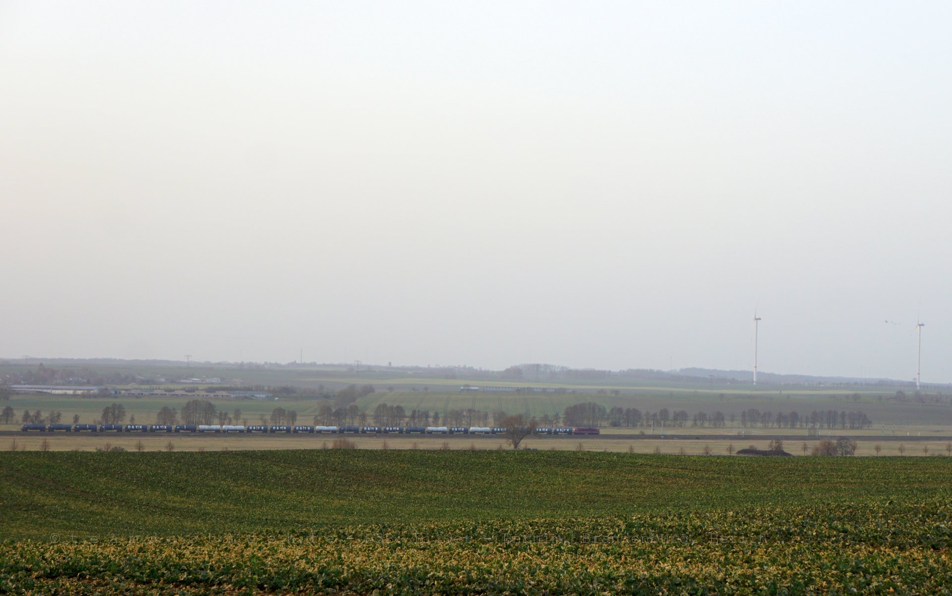Als ich oberhalb von Grünow durch die Hügel streife, sehe ich im Tal der Welse einen Güterzug aus Kesselwagen auf dem Weg über Passow nach Schwedt zum PCK. Gezogen wird er von einer Lok der DR-Baureihe 250, bei der DB als BR 155 bezeichnet. Auf Grund der Lackierung handelt es sich um eine Lok der LEG (Leipziger Eisenbahngesellschaft), die auch sehr oft in der Abstellung in Angermünde angetroffen werden können.