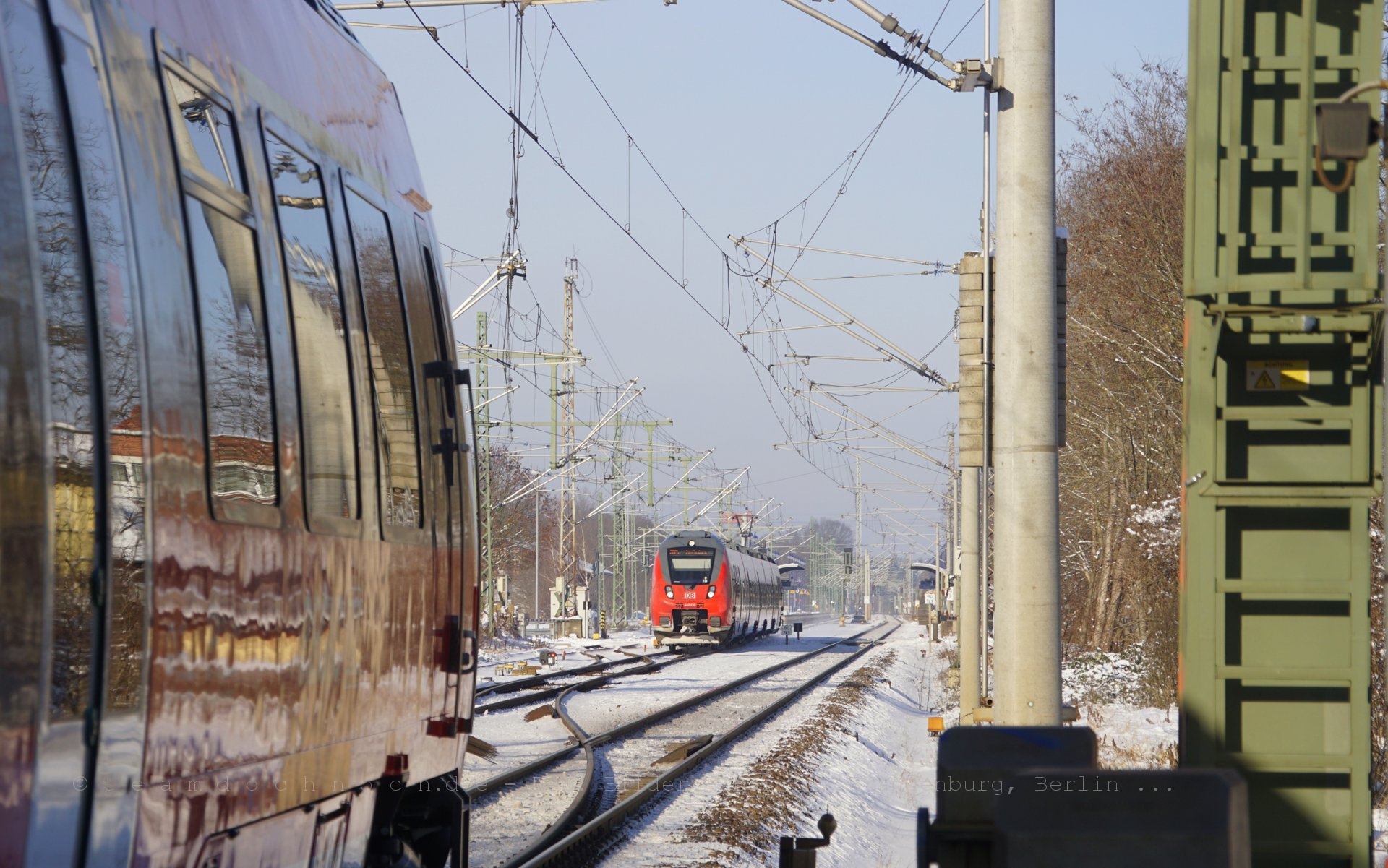 Kurz vor Lubolz (niedersorbisch Lubolce) treffe ich in der flachen Winterlandschaft am Rand des Spreewalds eine RB24 auf dem Weg nach Senftenberg.