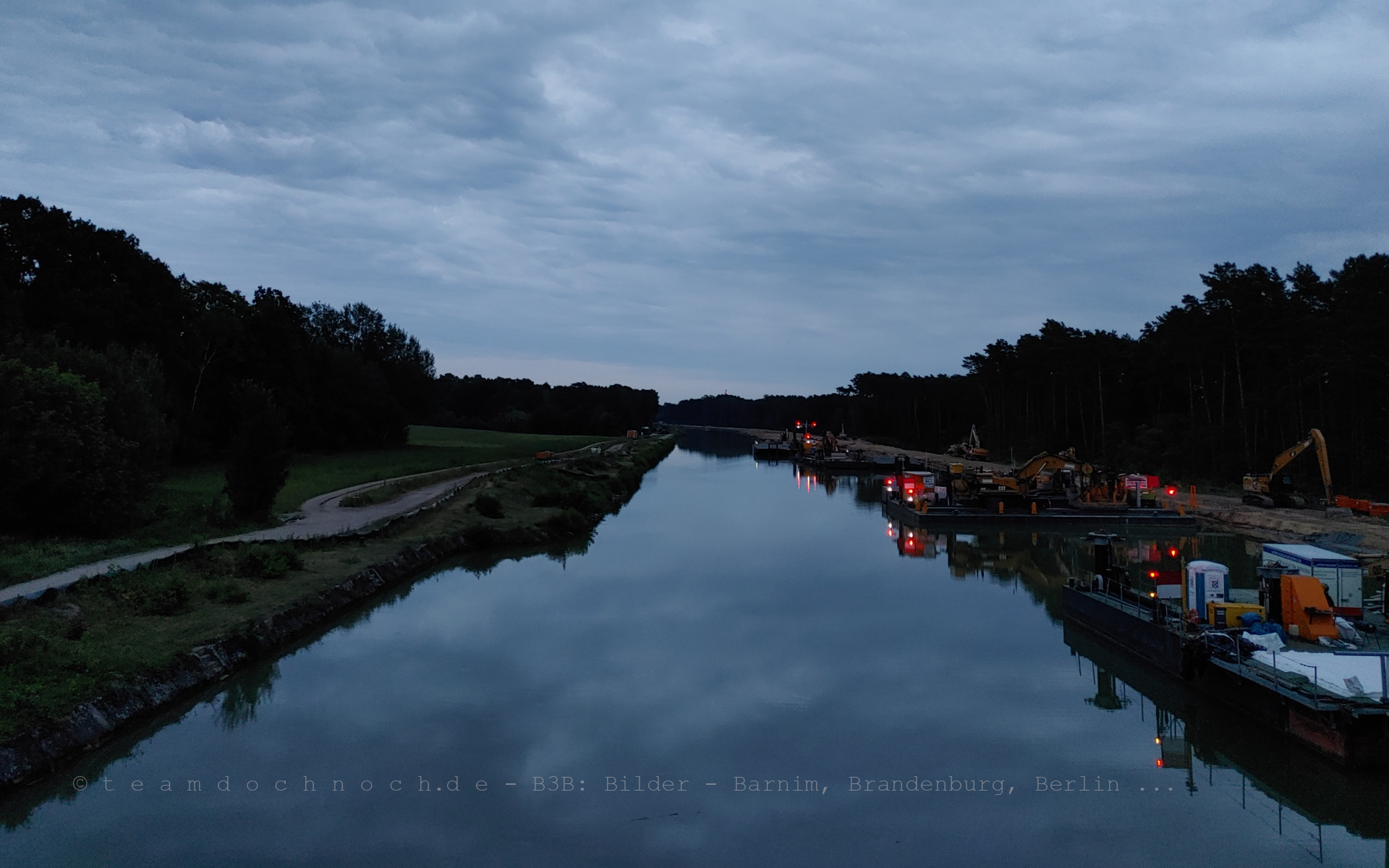 Ein abendlicher Blick auf den Bauzug der STRABAG (ehemals Möbius Wasserbau) für den Ausbau der HOW (Havel-Oder-Wasserstraße) im Los E2/F2 von der Kaiserwegbrücke.