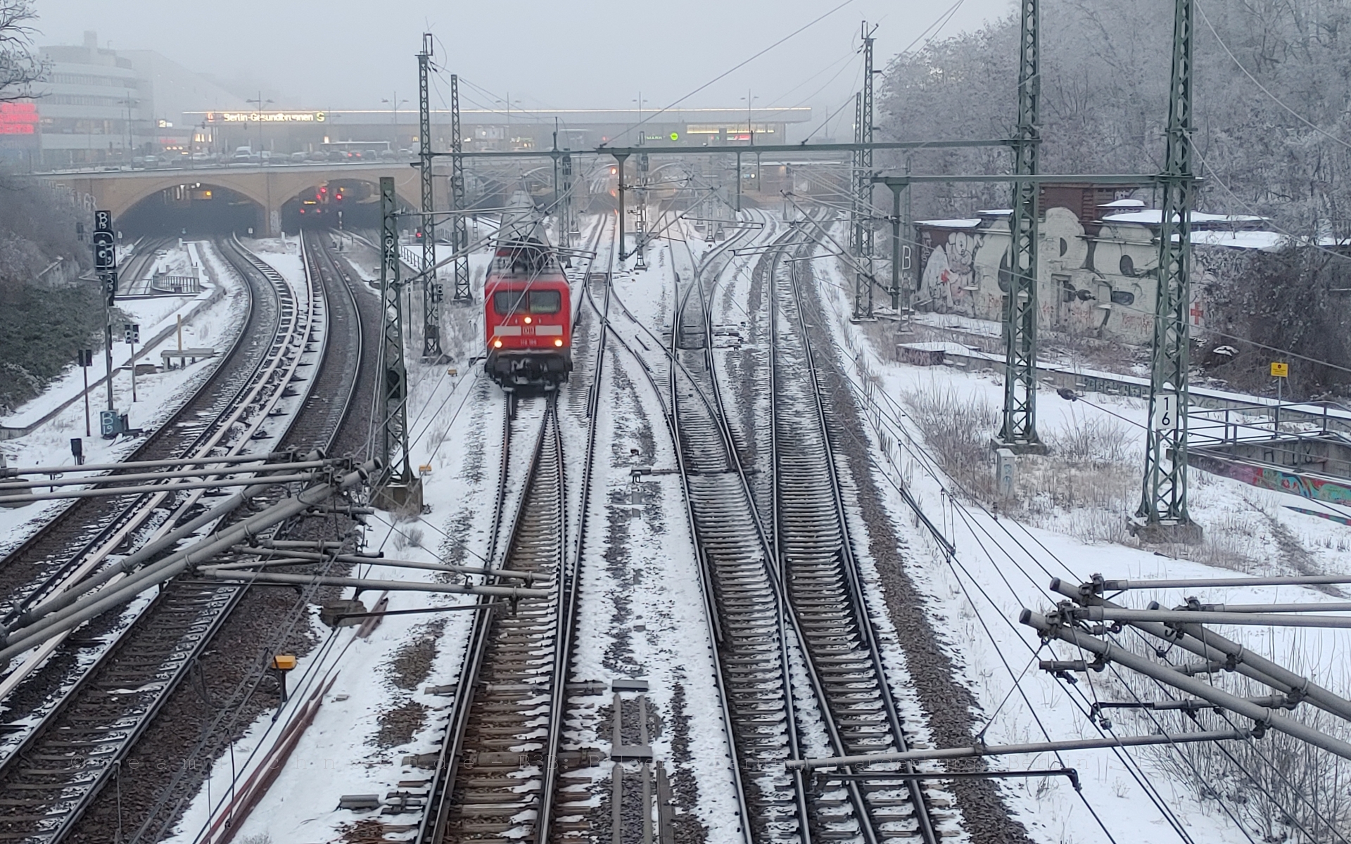 Der IC 2173 aus Rostock über Berlin nach Dresden kommt an einem grauen Februarmorgen an der Behmbrücke zum Stehen. Er setzt sich einen kurzen Augenblick später wieder in Bewegung, scheint sich aber zu quälen.