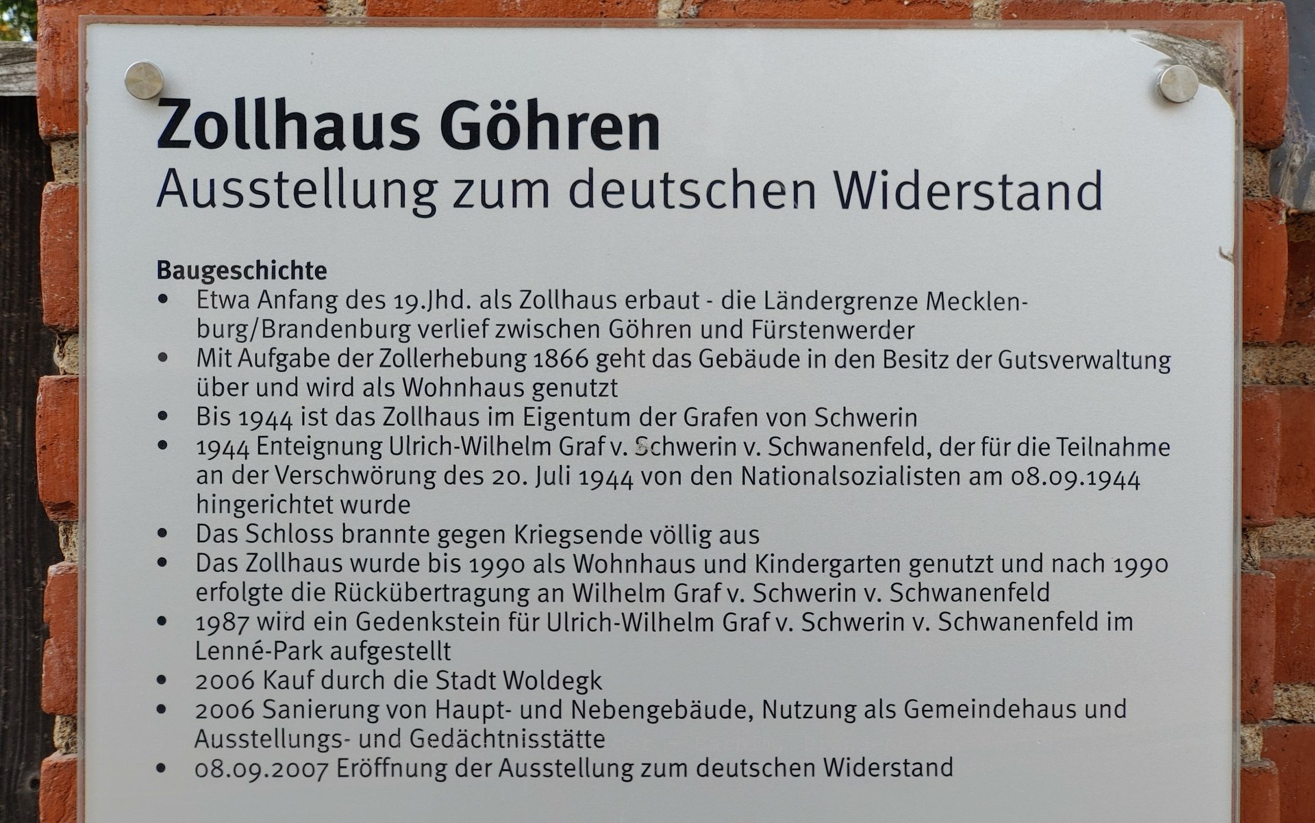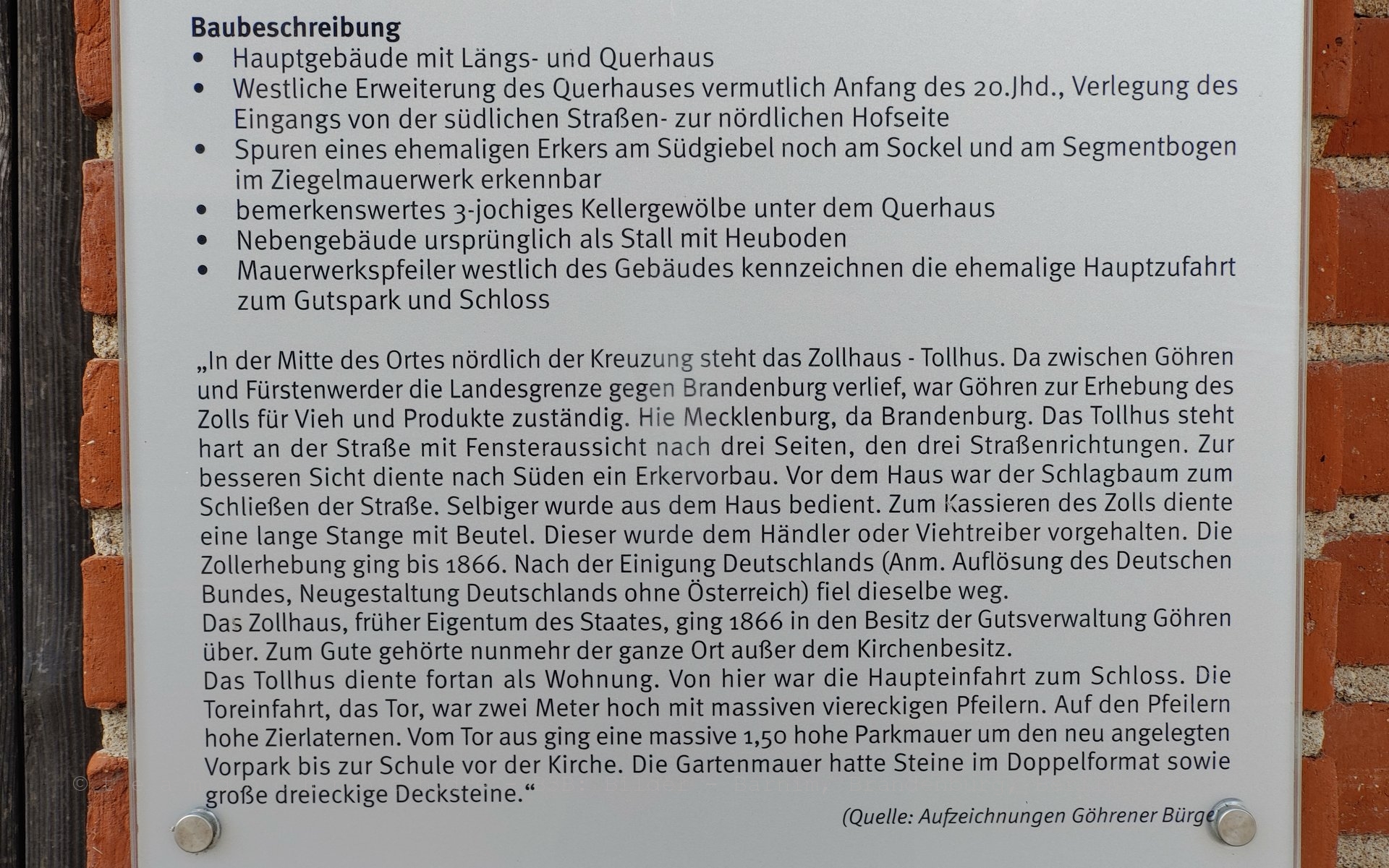 Das Zollhaus oder Tollhus von Göhren bei Woldegk. Erbaut am Anfang des 19. Jahrhunderts wurde es bis 1866 zur Eintreibung der Zölle an der Landesgrenze zwischen Mecklenburg und Brandenburg genutzt. Seit 2006 ist es im Eigentum der Stadt Woldegk, zu der Göhren inzwischen gehört, und wurde aufwändig saniert. Heute beherbergt es eine Ausstellung zum deutschen Widerstand.