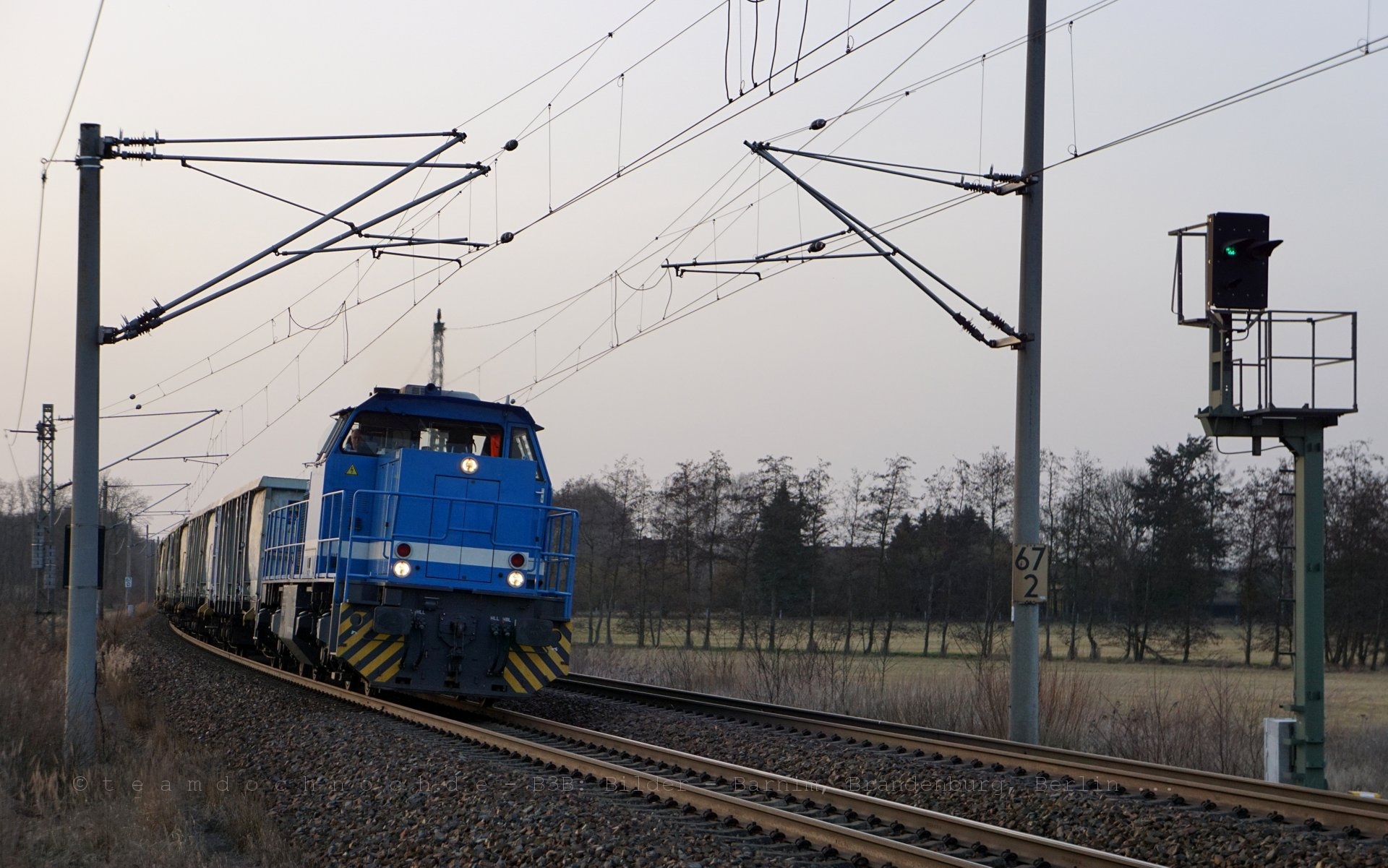 Bei Jacobsdorf an der Niederschlesisch-Märkischen Eisenbahn legt sich eine blaue G 1206 in die Kurve. Es handelt sich um die Lok Nr. 1522 der EAH GmbH (Eisenbahn Anlagen Handel GmbH). Die NVR-Nummer lautet: 9280 1275 843-1 D-BUVL