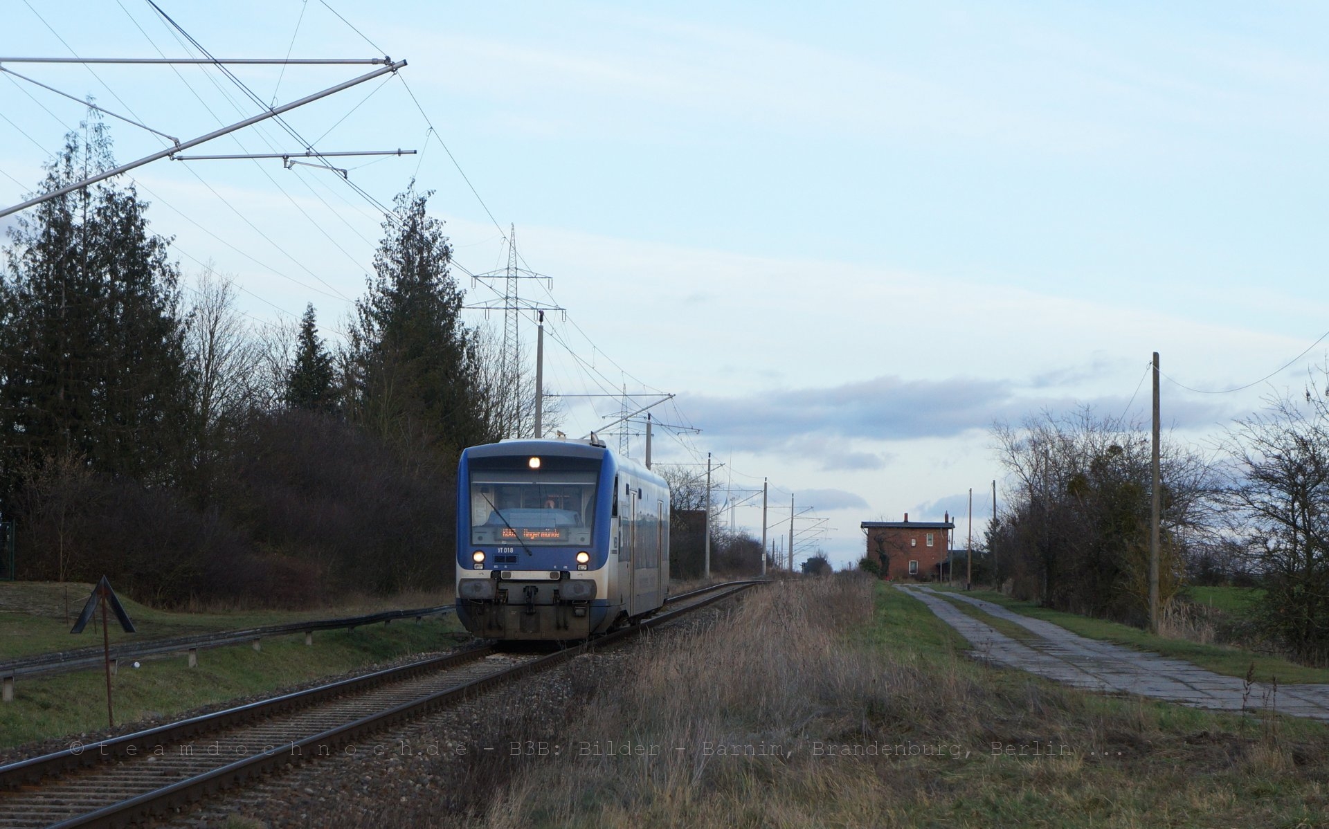 Regioshuttle VT018 der Niederbarnimer Eisenbahn / NEB durchfährt in der winterlichen Abenddämmerung als RB61 auf der Angermünde-Schwedter Eisenbahn den ehemaligen Bahnhof von Niederlandin (heute Teil der Gemeinde Mark Landin) in Richtung Angermünde.