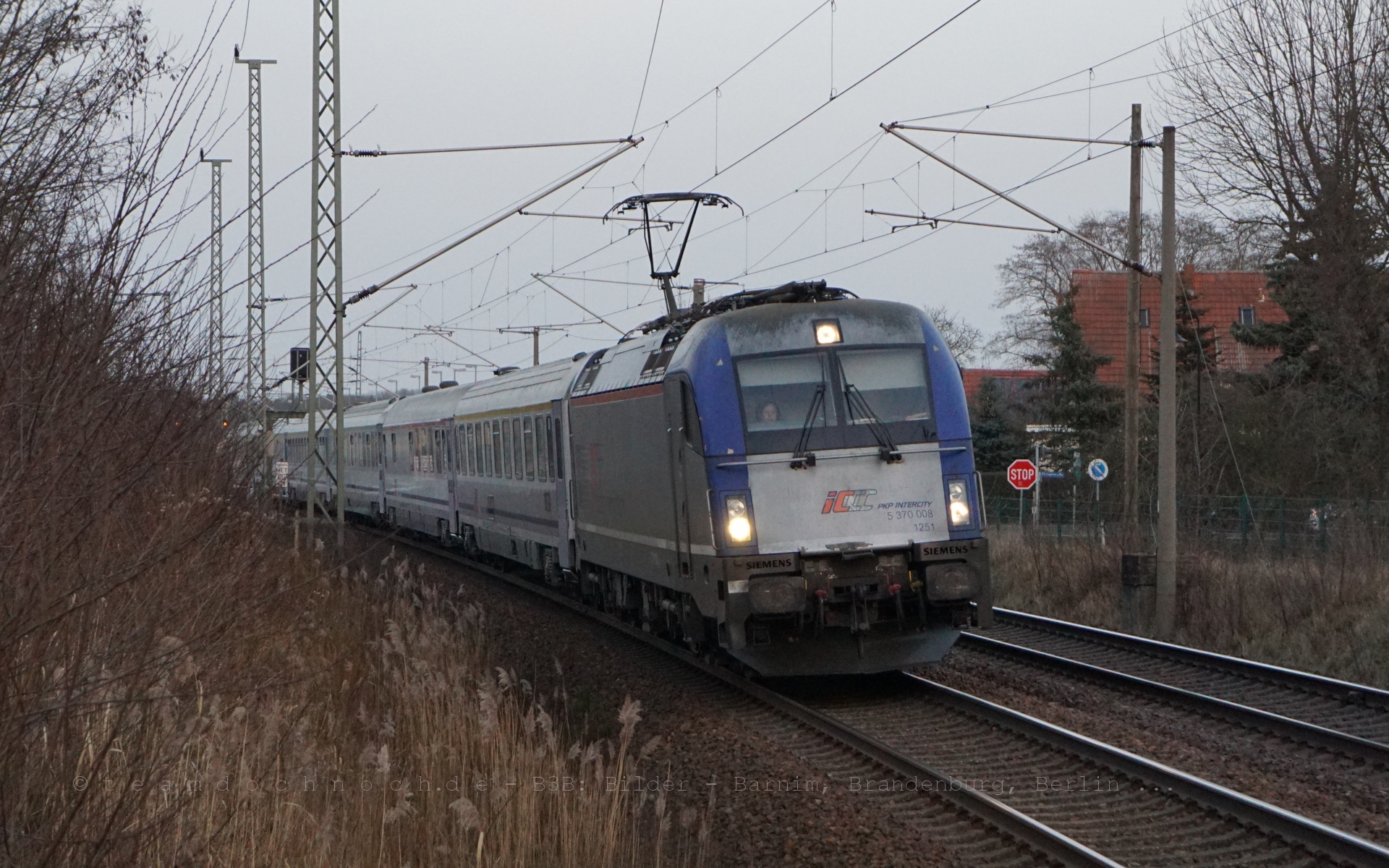 Als ich Jacobsdorf verlassen will, geht noch einmal die Schranke herunter und kurz danach rauscht der IC aus Warszawa nach Berlin rauscht durch den Ort. Gezogen wird er von 5 370 008 1251 (PKP EU44 Husarz).