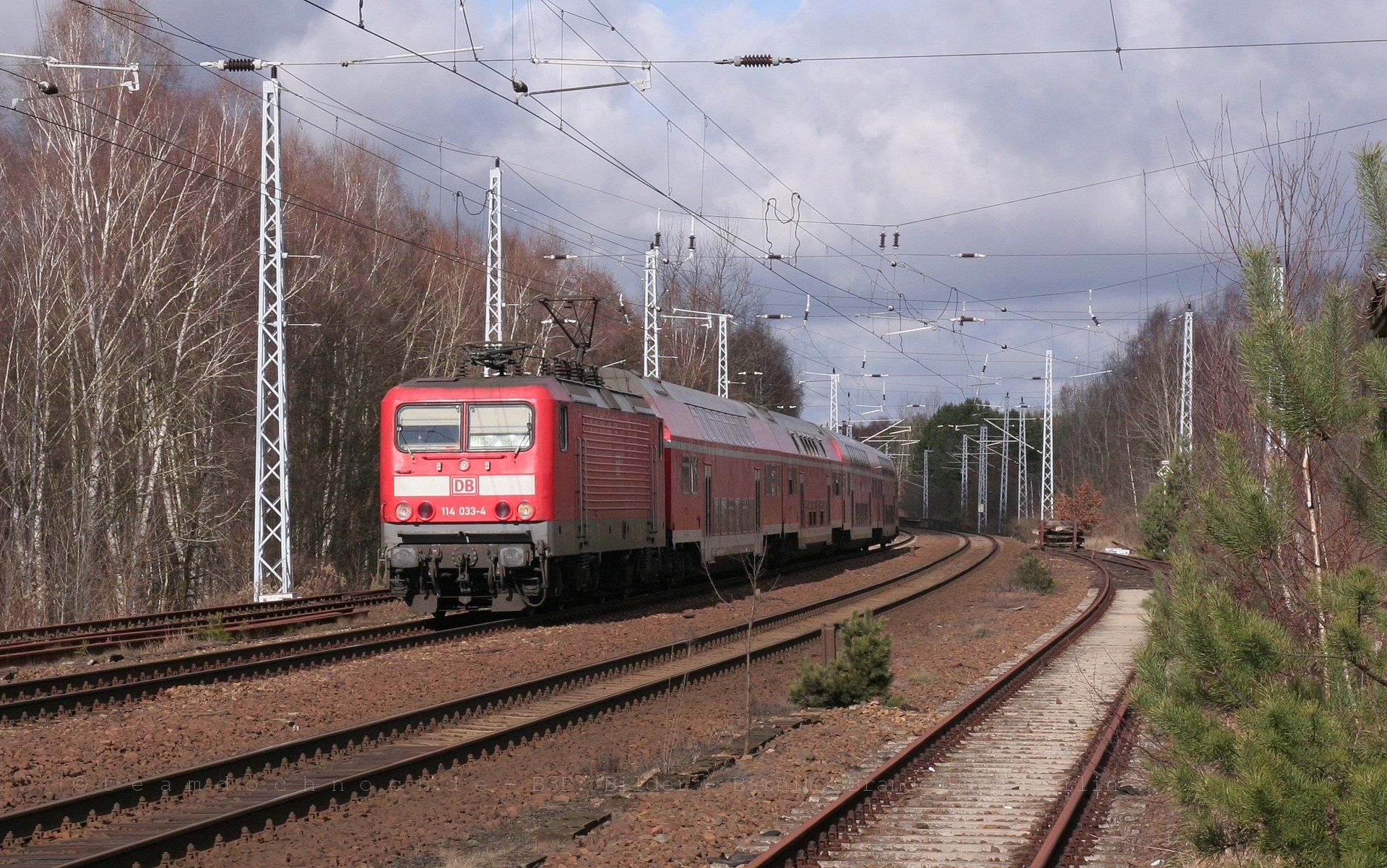 114 033-4 führt den RE5 in der Ortslage von Oranienburg Glashütte (kurz vor Oranienburg-Sachsenhausen) über die Berliner Nordbahn nach Süden.