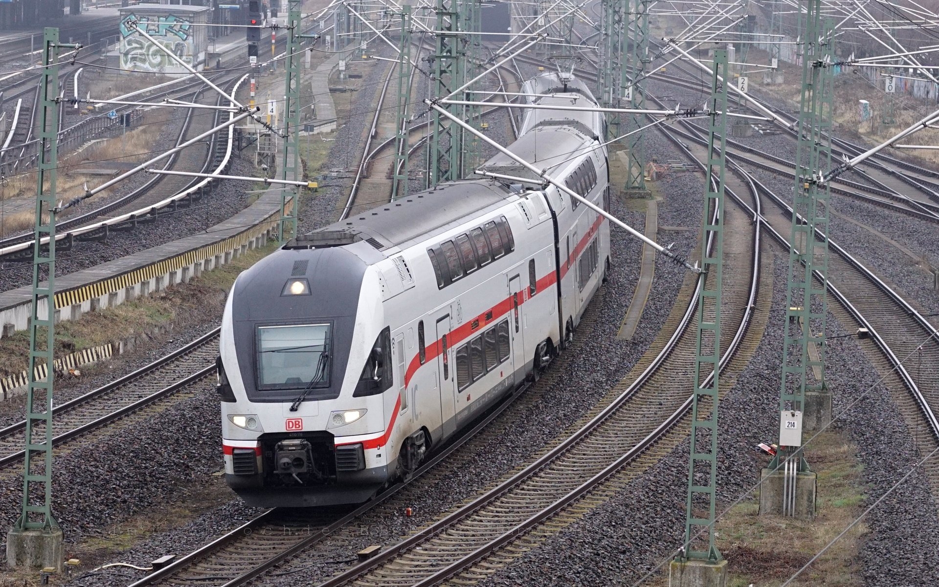 Der IC 2173 aus Rostock über Berlin nach Dresden kommt an einem grauen Februarmorgen an der Behmbrücke zum Stehen. Er setzt sich einen kurzen Augenblick später wieder in Bewegung, scheint sich aber zu quälen.