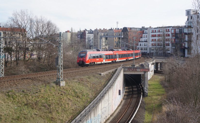 442 824 als RB24 in der Verbindungskurve zwischen Berliner Ringbahn und der Bahnlinie Berlin Stettin im Gleisdreieck Gesundbrunnen.