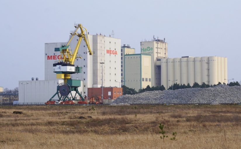 Der Binnenhafen Eberswalde ist derzeit u.a. durch Umschlagarbeiten für den Ausbau des Oder-Havel-Kanals im Bereich der Lose E2/F2 gut ausgelastet. Der große Steinhaufen im rechten Teil des Bildes wird demnächst die Ufer des Kanals vor Sog und Wellenschlag schützen.