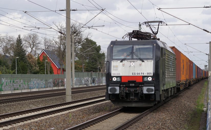 Vom südlichen Ausgang der Bahnunterführung „Am alten Gaswerk“ in Staaken gibt es einen Blick auf die Gleise der Lehrter Bahn und der Schnellfahrstrecke Oebisfelde-Spandau. Das Motiv ist durch die besprühten Lärmschutzwände eher trist, der Güterzug mit 189 805 bzw. ES64F4-805 entschädigt aber etwas.