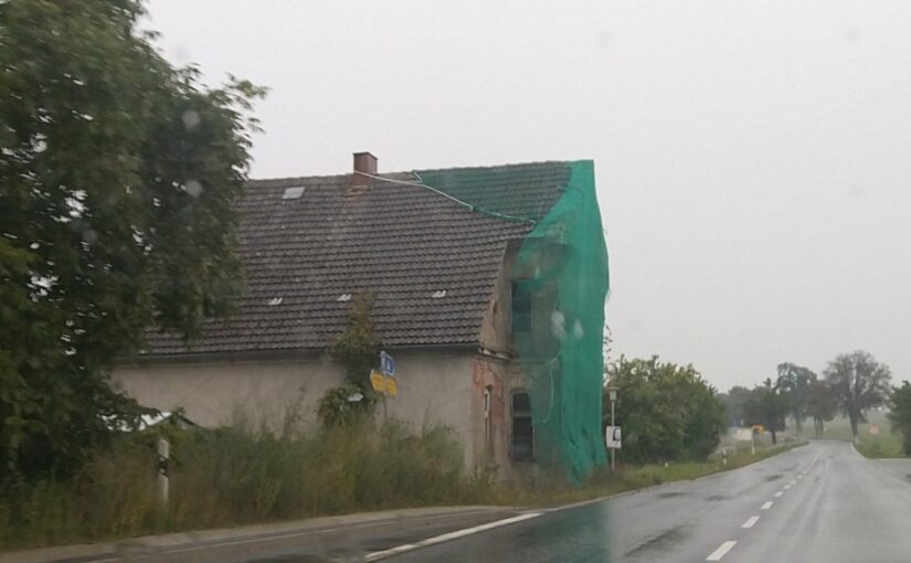 An einem regnerischen Septemberabend mache ich nur ein schnelles Smartfonebild vom Chausseehaus bei Petershagen an der B104. Der Zustand hat sich gegenüber früheren Bildern durch das vorgehängte Netz wieder einmal verschlechtert und eigentlich kann bei der nächsten Vorbeifahrt das Chausseehaus Geschichte sein.