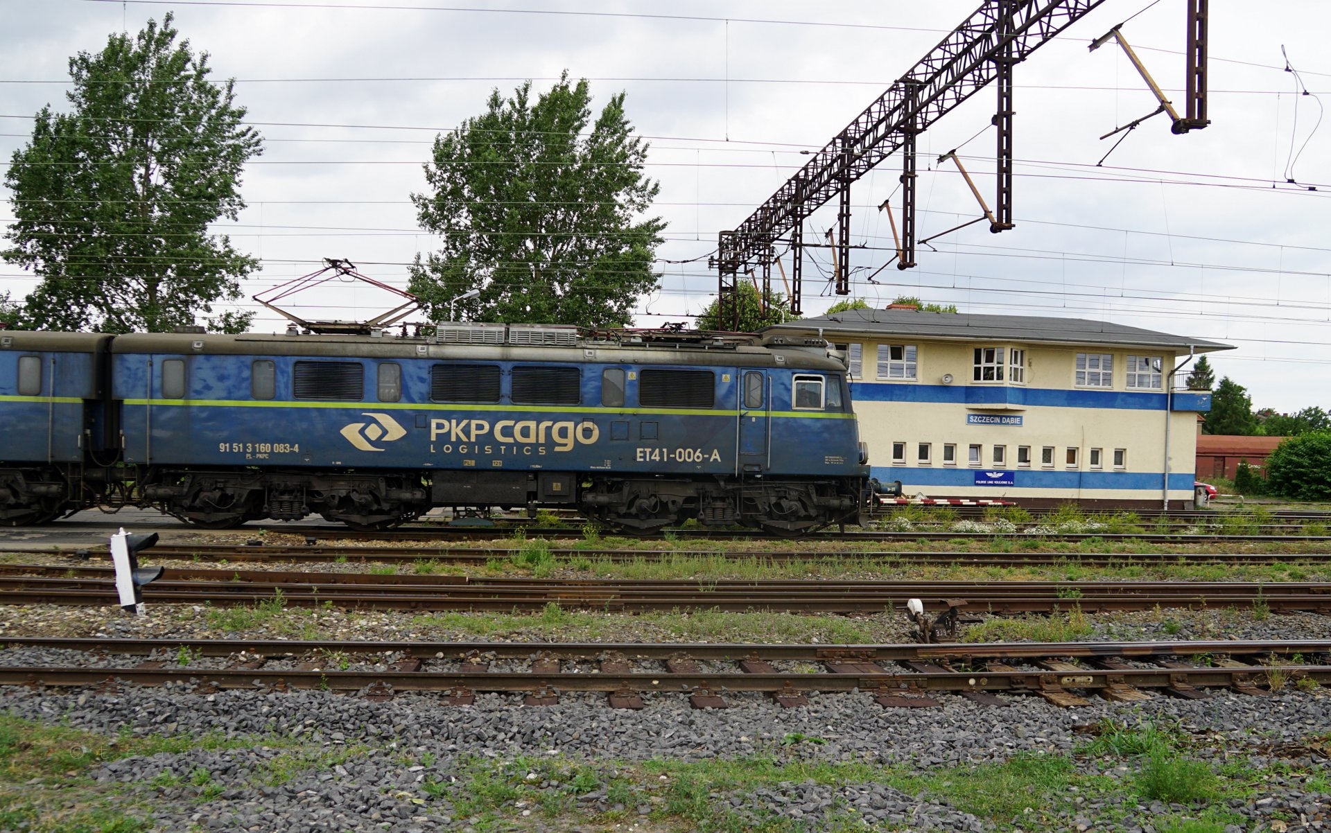 ET41-006 fährt mit einem Zug aus offenen Güterwagen langsam durch den Bahnhof von Szczecin Dąbie.