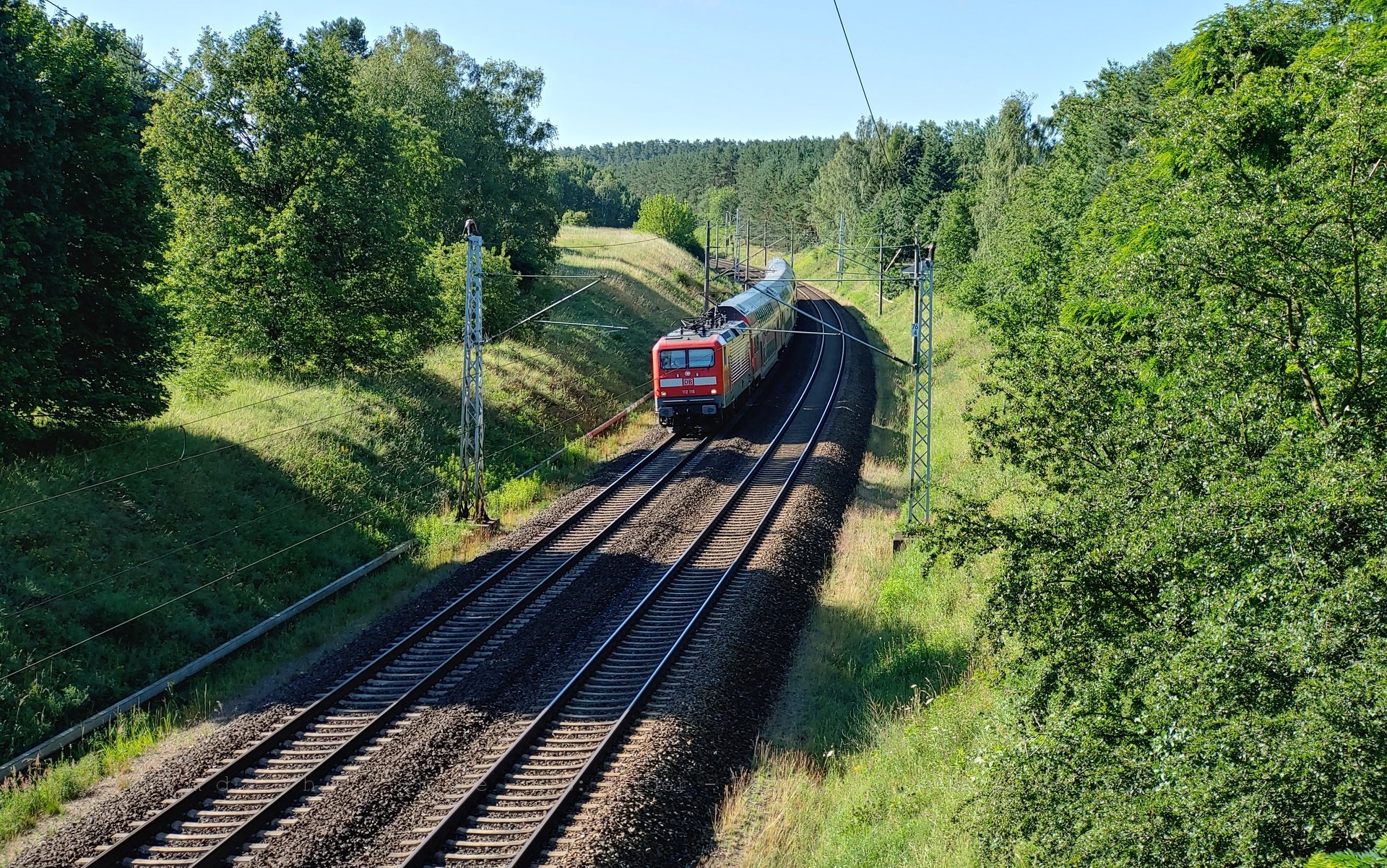 Stadler KISS 4110 612 der DB AG als IC (IC 2178) nach aus Dresden nach Warnemünde, gesehen in Nassenheide (Oberhavel). Der IC kommt heute ca. 10 Minuten nach Plan, seit der planmäßigen Abfahrt in Oranienburg sind ca. 15 Minuten vergangen. Die wesentlich langsamere RB12 benötigt 8 Minuten von Oranienburg nach Nassenheide.
