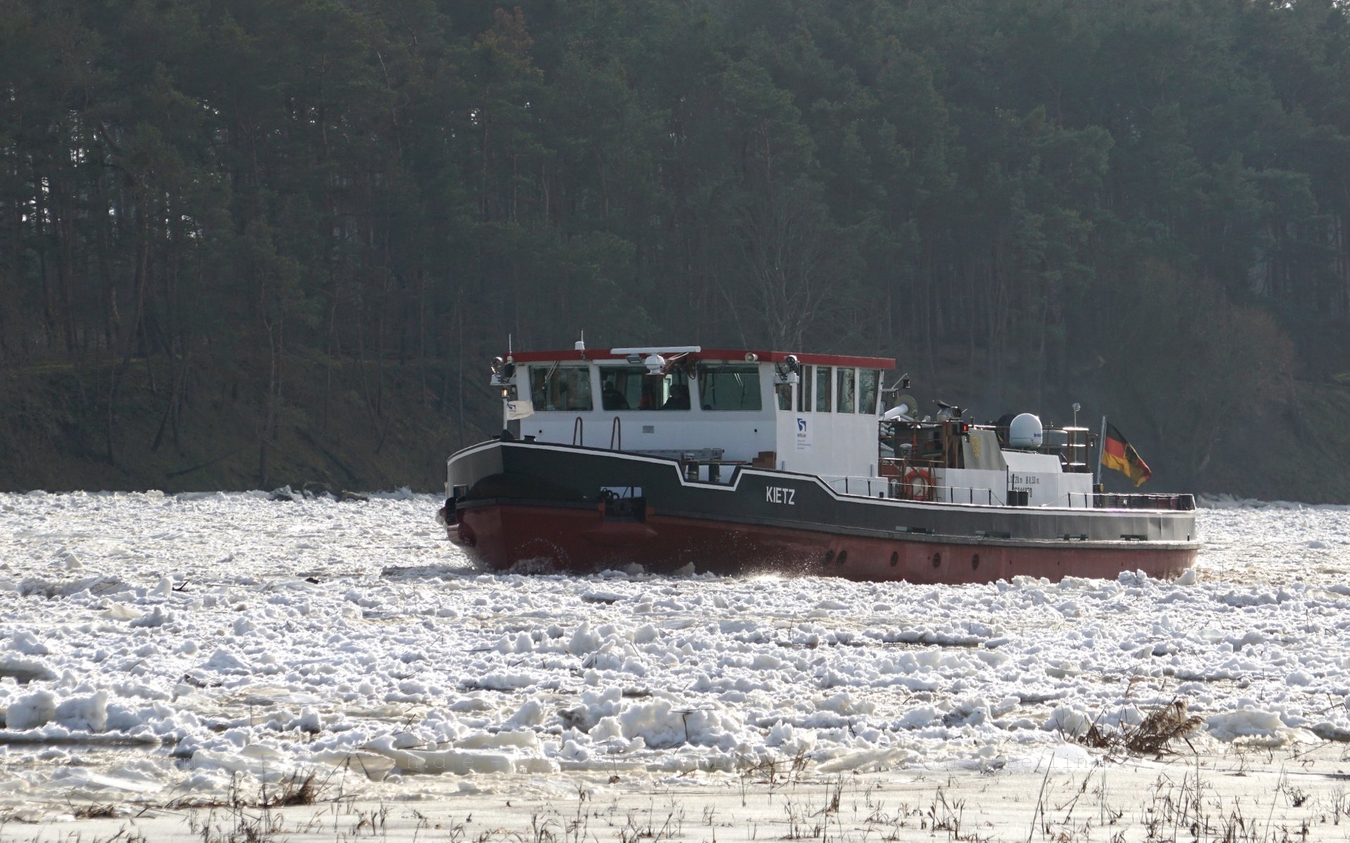 Die Eisdecke auf der Oder ist nicht mehr geschlossen, aber trotzdem bleibt für die Eisbrecher noch genug zu tun. Das Eis muß am Laufen gehalten werden, damit es nicht zur Bildung eines Eisversatzes kommt und damit regional die Gefahr eines Hochwassers besteht.
