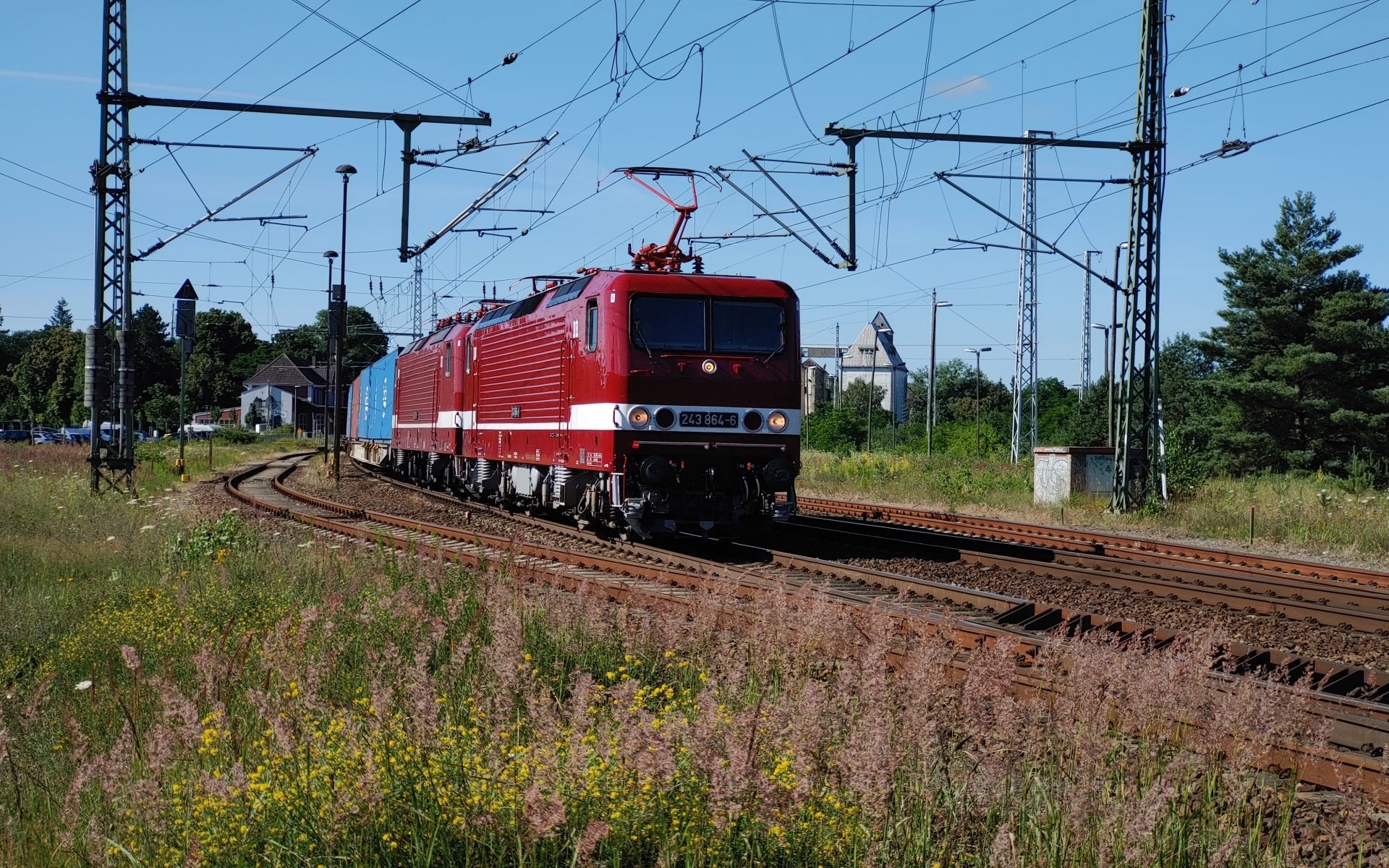 Als die Hitze des Tages zunimmt und die Konturen in der Ferne langsam verschwimmen, kommt von Norden mit der 151 038-7 der BayernBahn GmbH der erste besondere Zug des Tages durch den Bahnhof von Fürstenberg an der Havel.
