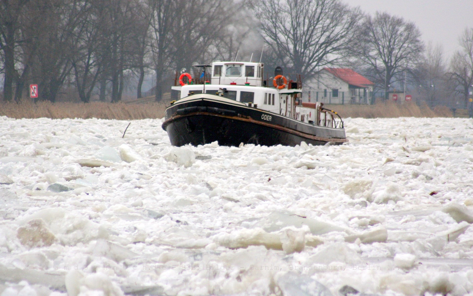 Die Eisdecke auf der Oder ist nicht mehr geschlossen, aber trotzdem bleibt für die Eisbrecher noch genug zu tun. Das Eis muß am Laufen gehalten werden, damit es nicht zur Bildung eines Eisversatzes kommt und damit regional die Gefahr eines Hochwassers besteht.