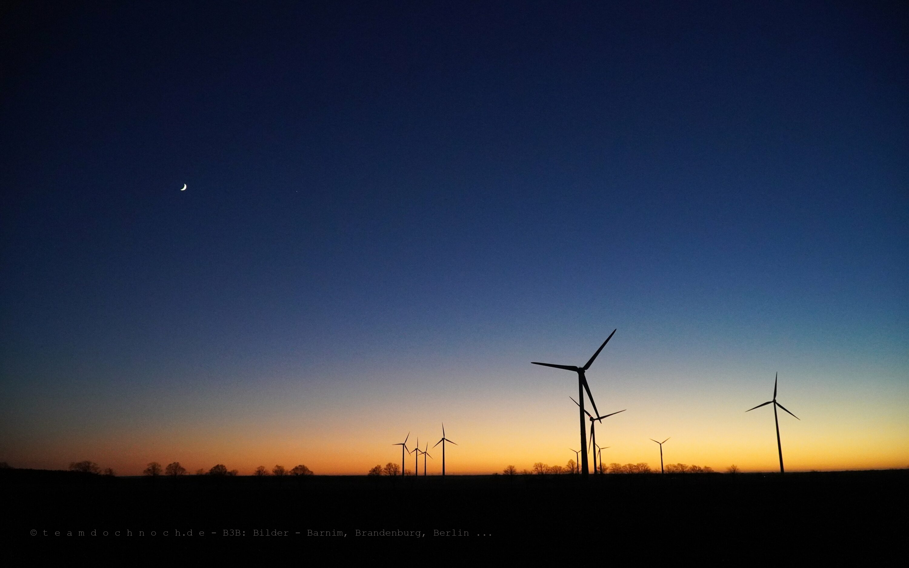 Die Dämmerung währt nur kurz, der Mond lauert schon, während die Windkrafträder die letzten Atemzüge des Winterwindes ausnutzen.